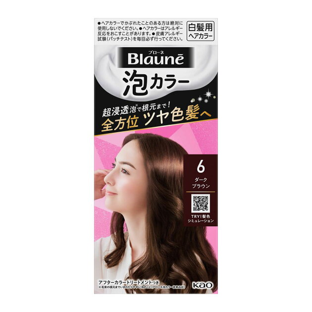 ヘアカラー ブローネ 泡カラー 6:ダークブラウン 医薬部外品 泡タイプの白髪染め。 泡がいきわたるから後ろも内側も染め残しなし! もみこむだけで泡がクリーム状に変わるので放置中もたれずに密着して浸透。 白髪を深く染めて、ムラなく美しい髪色に。 指どおりなめらか、しっとり質感の染め上がり。 毛髪保護成分(水解シルク液、軟質ラノリン脂肪酸)配合。 リペアトリートメントつき。 ヘ.