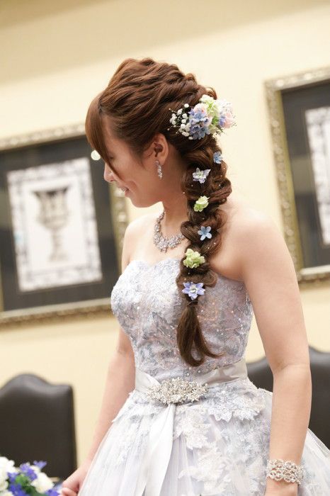 プレ花嫁の結婚式 ウェディング 準備サイト Marryマリーさんはinstagramを利用しています ブルーの大人可愛い ラプンツェルヘア を発見 かすみ草 や ブルースター などの 生花の ヘッドパーツ をぽんぽんと 編みおろしヘア に 飾っています